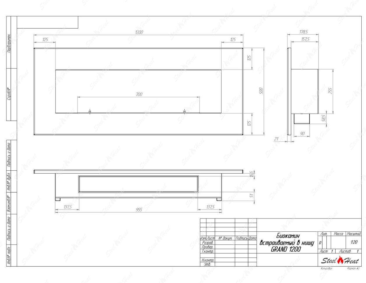 Встраиваемый Биокамин SteelHeat GRAND-V 1200 предназначен для встраивания в глухие ниши из гипсокартона, кирпича, пеноблоков, бетона.
