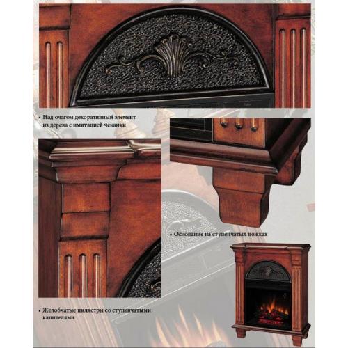Электрокамин Regent - оригинальный и интересный по своему дизайну каминокомплект. Над электрическим очагом - декоративный элемент из массива дерева с имитацией чеканки. Основание камина на ступенчатых ножках. По бокам электрокамина распаложены пилястры со ступенчатыми капителями. Модель отличается компактностью, что особенно актуально для небольших помещений.