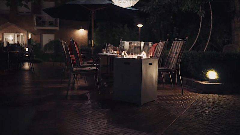 Очаг стола камина заполняется лавовыми или стеклянными камнями и Ваш уличный стол камин готов к использованию.